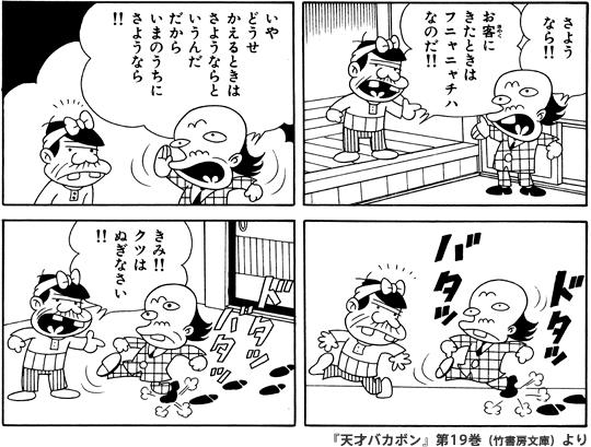 | そうなんですか。 『天才バカボン』の表紙に 「俺の名前は要らない」と言ったのも そうだし、 タモリさんをベッドに寝かせて 自分は床で寝ていたのもそんな感じですよね。 結局、赤塚さんは一貫して そういうところがあったようです。 ギャグだって、キャラクター設定の縛りは 「だいたい」でよかったのかもしれませんね。 それよりも、おもしろさや、 みんなが喜んでくれることが最優先なのかも。 あまり自分が前には出ない人だったんです。 おまかせパワー爆裂ですね。 |