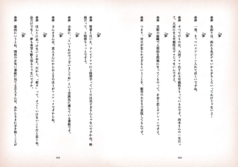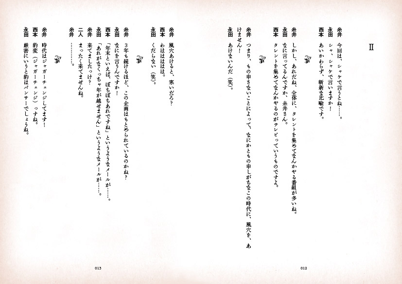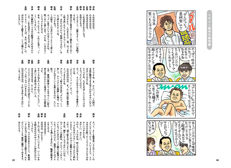![]() 「似てるわ(笑)」と吹き出すほど クオリティーの高い似顔絵と、 「くだらないわ(笑)」と呆れるほどのダジャレ、 そしてしばしば読者を 「‥‥なんだって?」と煙に巻く複雑なプロット。 こんなに高密度な情報が、 たった4コマに収められているのですから驚きです。 第1回ほぼ日マンガ大賞受賞作家、荒井清和、 待望の単行本第2弾がついに完成しました! 前作にも増して、見所満載、ボリュームたっぷり! ![]() 連載150話の中から、厳選した100話を選び、 執念深く修正を施して1冊にまとめました。 情報量の多さには定評のあるマンガですが、 それが100話も集まると、圧倒的な読み応え! どうぞ、じっくりお読みください。 ![]() この本のために描きおろされた 4ページの(荒井先生にしては)長編マンガを収録! 時空を超えたセクシーSF超大作、と、 まぁ、いえないことも、ありません。 さらに、4コママンガも1本描きおろし! こりゃぁ、お得! という仕上がりになっています。 ![]() 前代未聞、出版業界に大きな波紋を 投げかけたといえなくもない、 あの雑談解説はもちろん健在! 糸井重里とほか2名(西本・永田)から成る 「ほぼ日テレビガイド男子部」が 100本のマンガすべてを雑談解説しています。 もちろん、この本にのみ収録。 その雑談量、なんと7万7千字! 非常識! ![]() 「だいたいの仕様はわかったけど、 手にとらないとピンとこないなぁ」 というあなたのために、 立ち読みコーナーをつくってみました。 見開き形式でいくつかお読みいただけることはもちろん、 前作でご好評いただきました、 「立ち読み動画」も準備しましたよー。 この「立ち読み動画」ってのがなにかというと、 「全ページをぱらぱらめくる立ち読み動画」です。 ![]()
