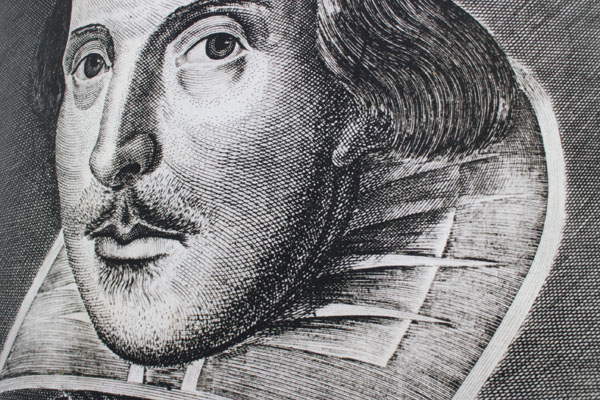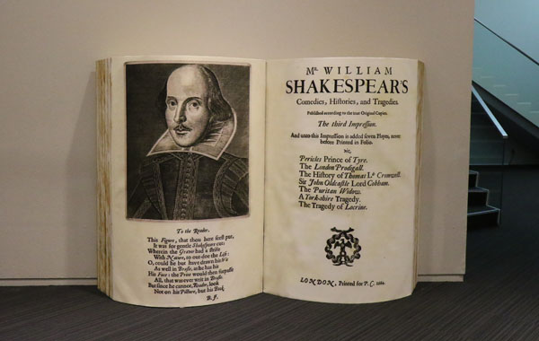 さて、この「本」の絵柄はなにかといえば、シェイクスピアの戯曲集です。世に「サード・フォリオ2刷り」(*)と呼ばれる本の扉の見開きをコピーしたものです。原本は河合祥一郎さんにお借りしました。