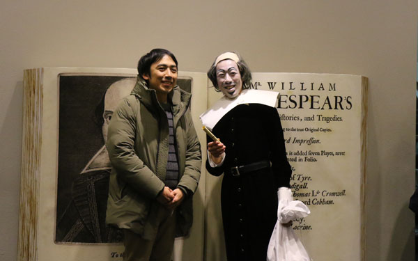 さて、巨大本の話に戻ります。シェイクスピアの講義が行われる日に「ほぼ日の学校」の教室入口に置かれるこの「本」は、撮影スポットとしても人気です。昨年末のイベントでは、カクシンハンの俳優・岩崎MARK雄大さんが「シェイクスピアさん」として、一緒に記念撮影に応じてくれました。