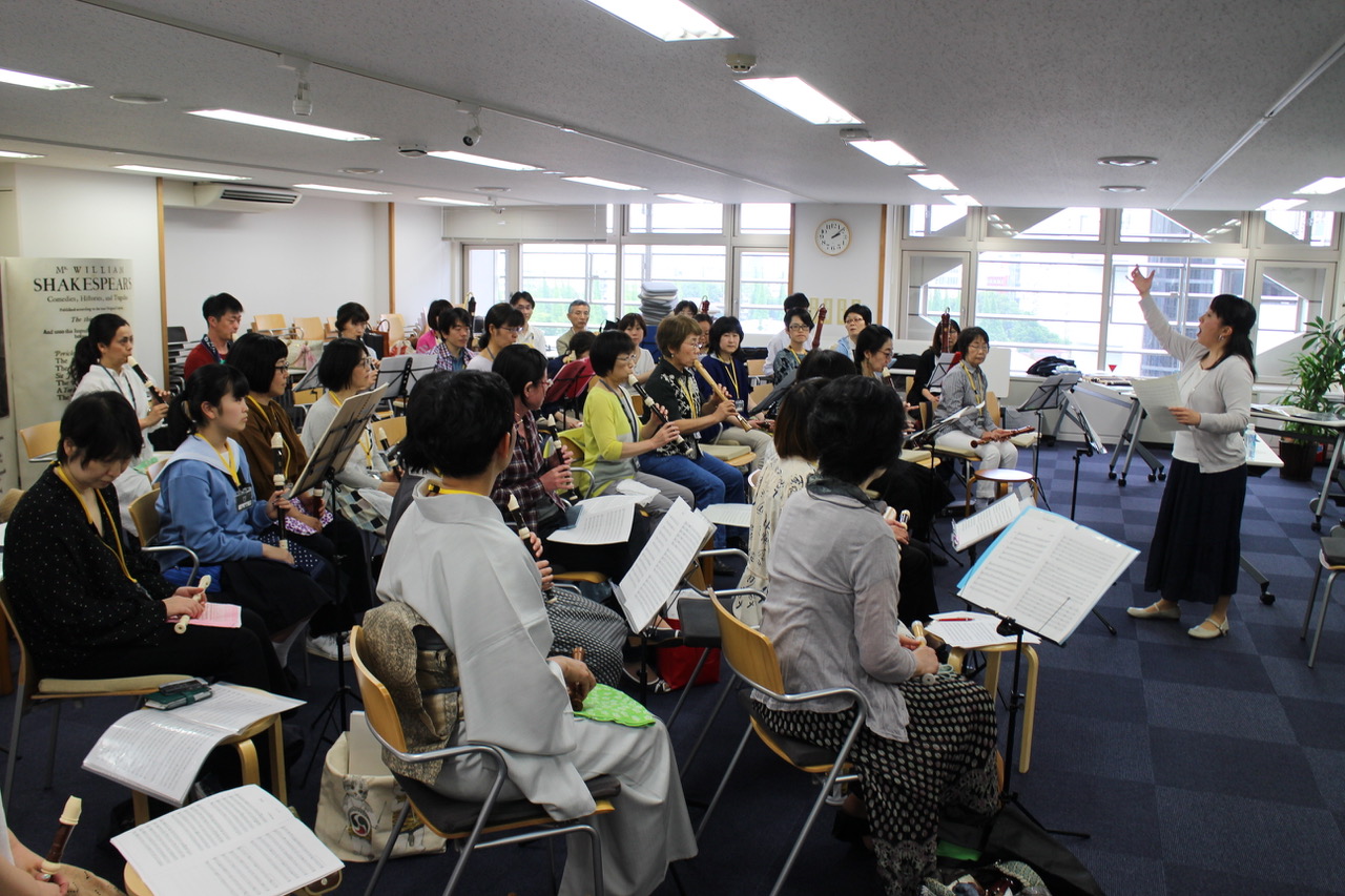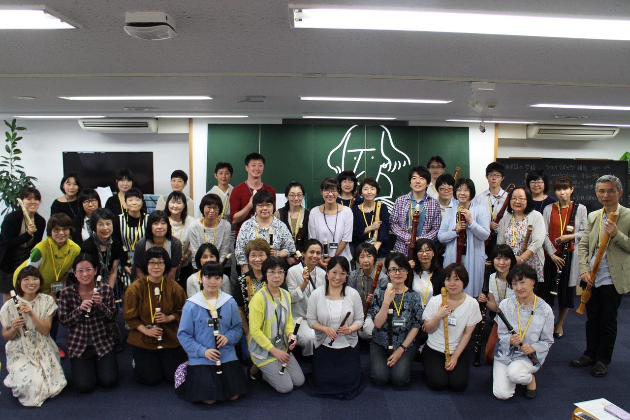 ワークショップ参加者の半分(19人)は、「シェイクスピア講座」の受講生です。「笛を手に持つのは中学校以来!」、「この講座を受けなければリコーダー合奏なんて考えたこともなかった」という人がほとんどです。ほんの数名、吹奏楽部出身者もいたようですが‥‥。