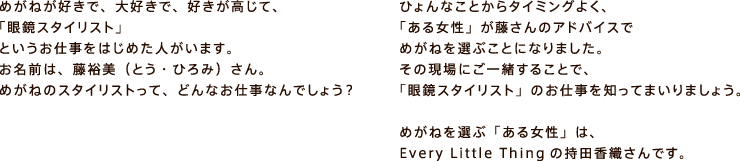 | ── | 藤さんのアドバイスを受けながら めがねを選んだ持田さんですが、 どうでしょう? 今後はひとりでも、 めがね屋さんで楽しめそうでしょうか? |