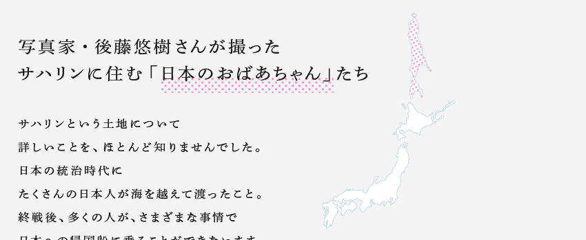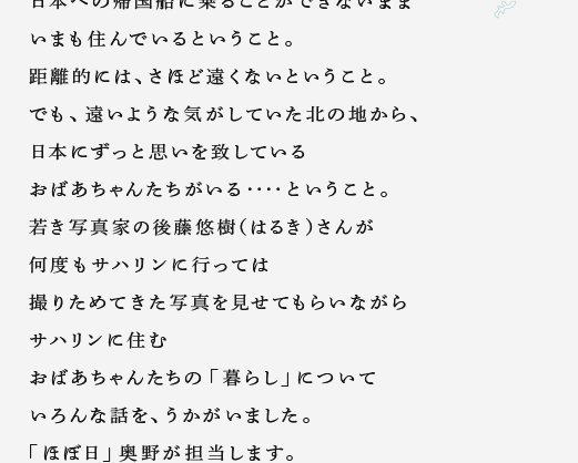 | 後藤 | 「サハリンには 何人もの日本人のおばあちゃんがいる」って。 ぼく、そのことを知って、 ものすごく、サハリンに行きたくなったんです。 |