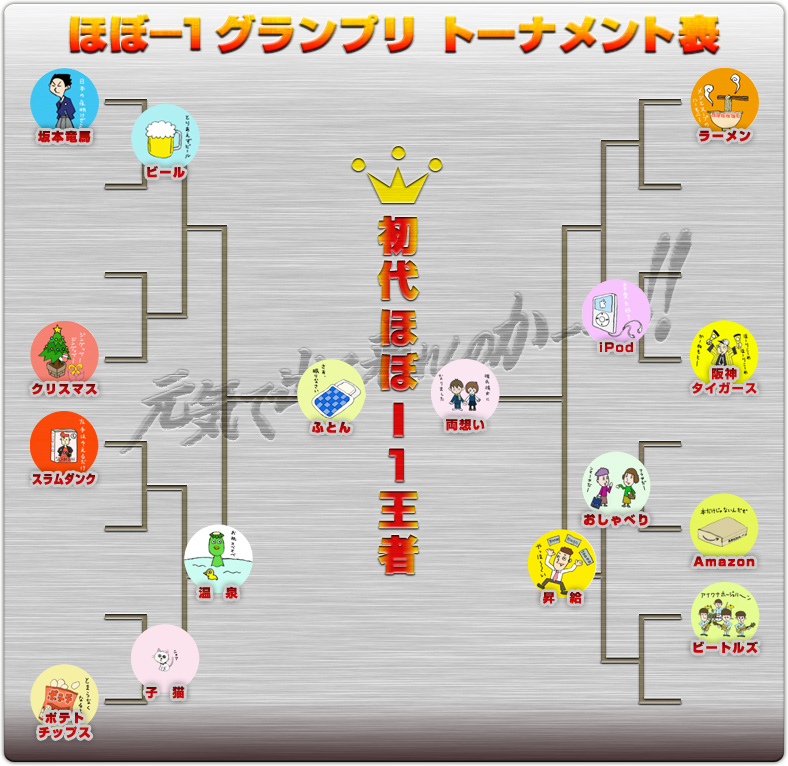 | というわけで、勝ち上がったのは、 「ふとん」と「両想い」! さぁ、万感の思いを込めて、 トーナメント表を見返してみましょう! |