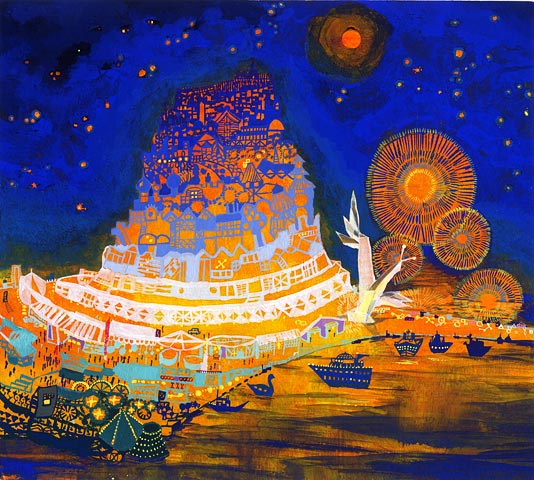 広い運河に巨大なモニュメントがライトで浮ぶ。