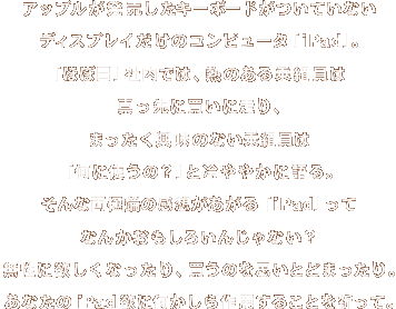 さぁさぁ無駄話はそのくらいにしておいて、 今回はiPadを手に入れた12名のうち8名に 購入に至った経緯からオススメのAPPまで いろいろと聞いてみました。 実際に買った人たちですから、 何か役立つことを言うかもしれませんよ。 しかもこの8人、購入に踏み切る理由はそれぞれありますが、 その背中を押した大きなキッカケが 「いまお店に行けば買える!」なんです。