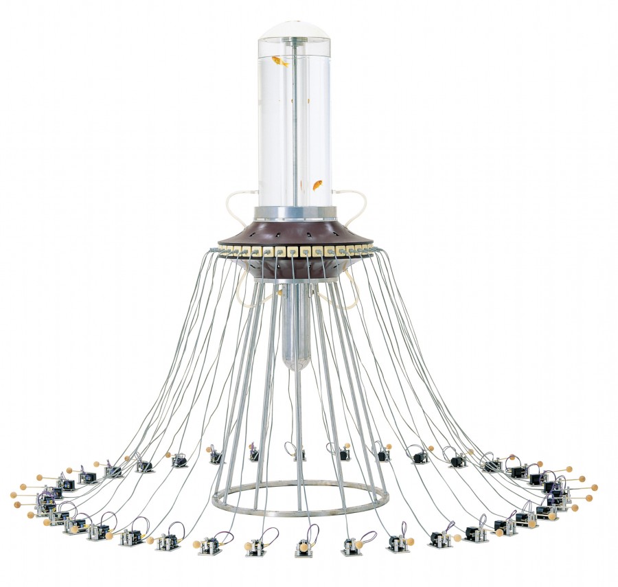 水槽内で回転するレーザーを魚が遮ると、その真下のノッカーが動く。