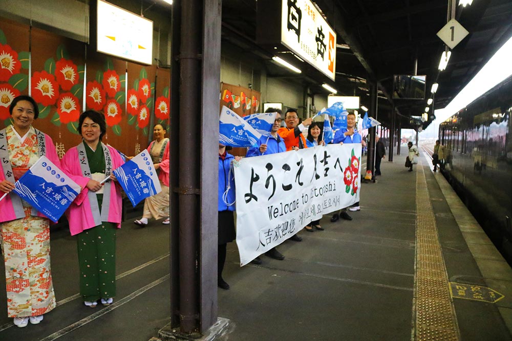 前川さんと糸井を乗せて人吉駅に到着しました。