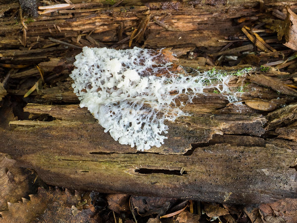 粘菌の白い変形体が、餌を求めて、倒木の上を右側から左側へ移動中。