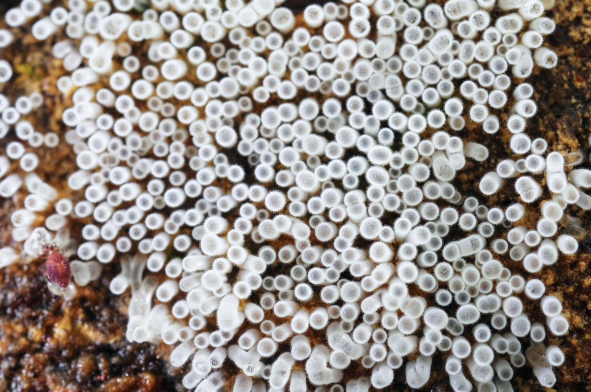 これも倒木の上。子実体の白い部分は子嚢(しのう)と呼ばれ、
