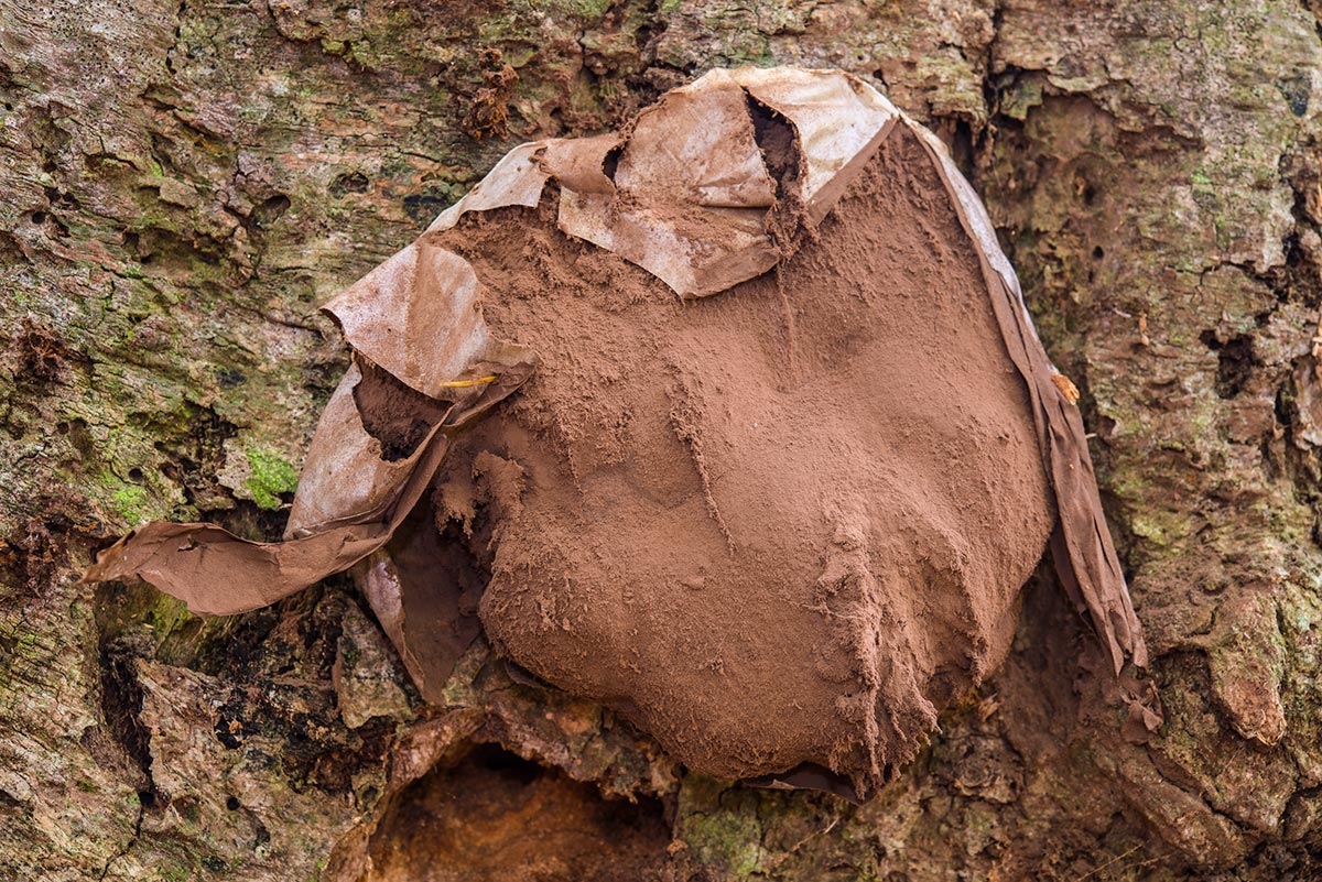銀色の金属光沢を持つ外皮膜が破れ、むき出しになった茶色い胞子が、