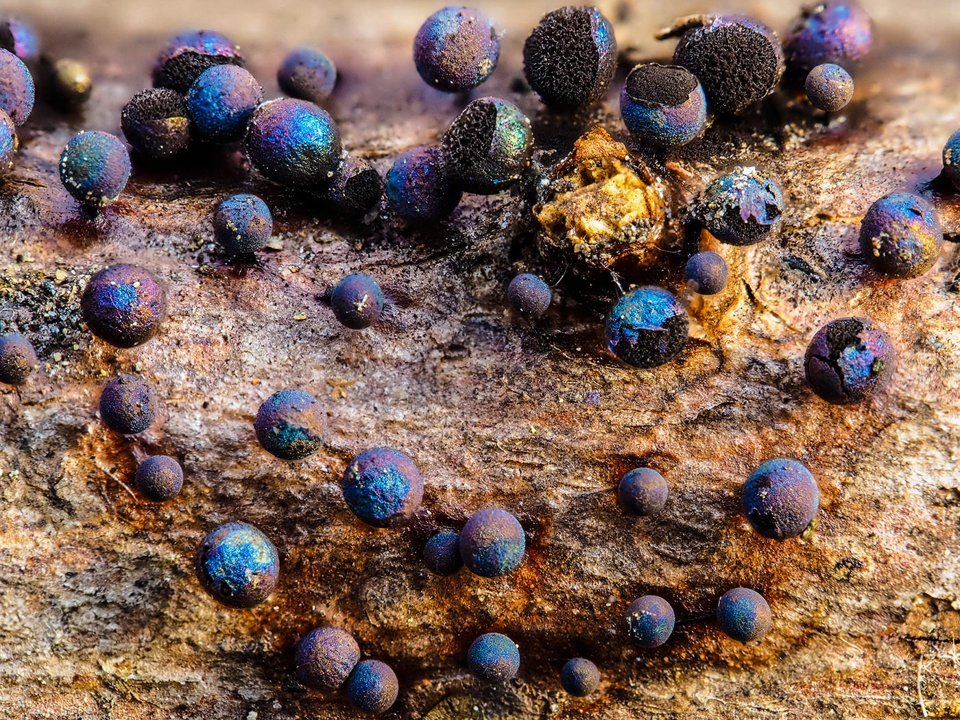 粘菌の子実体は、各種昆虫やカタツムリの大好物です。