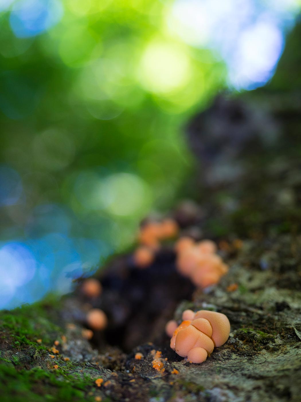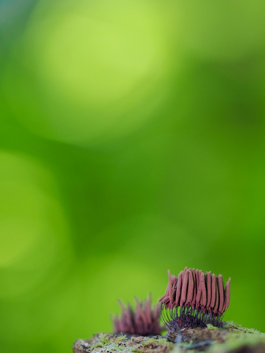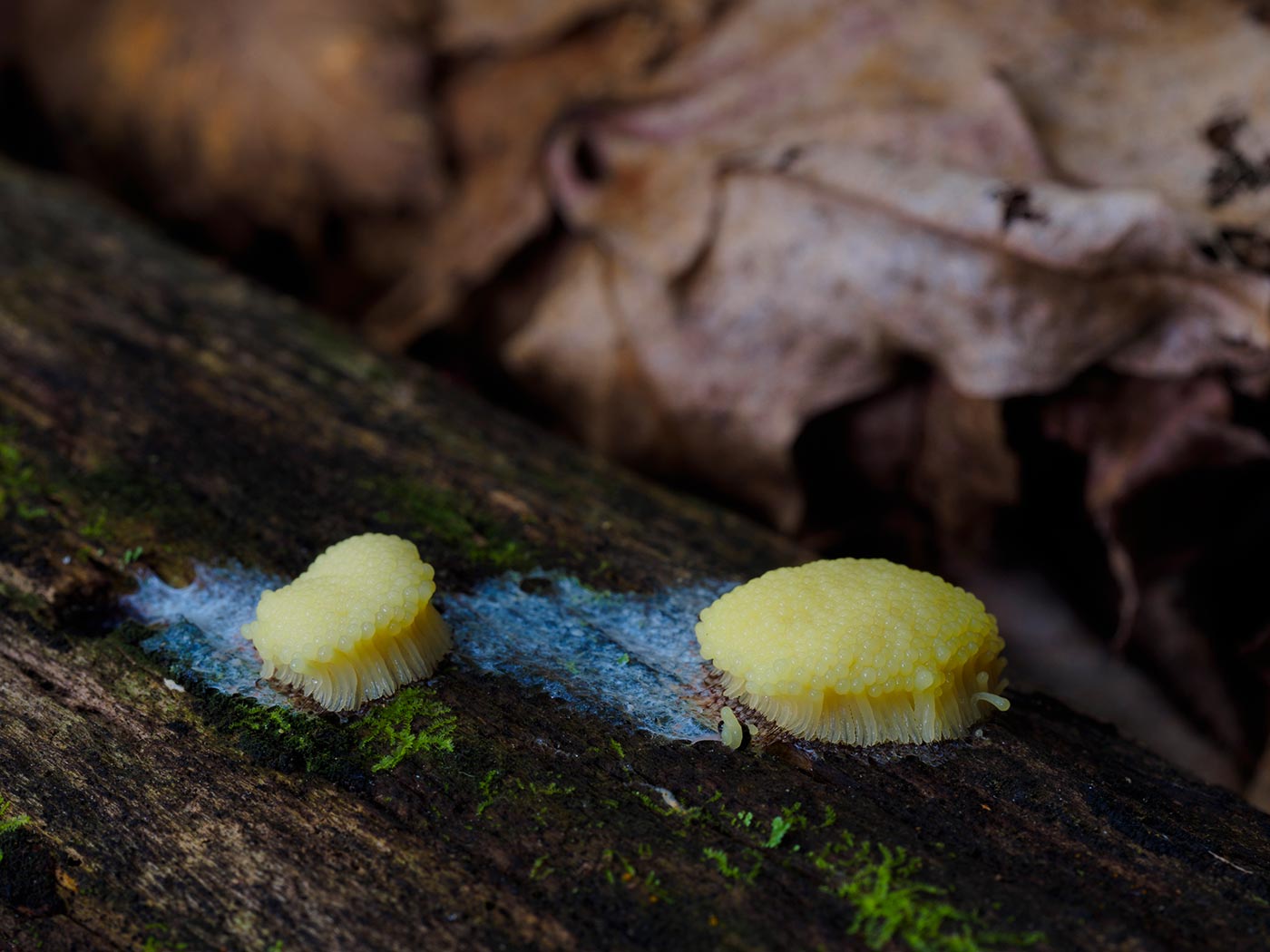 粘菌の子実体も、きのこと同じく、暗い倒木の中から明るい外界へと這い出した変形体は、