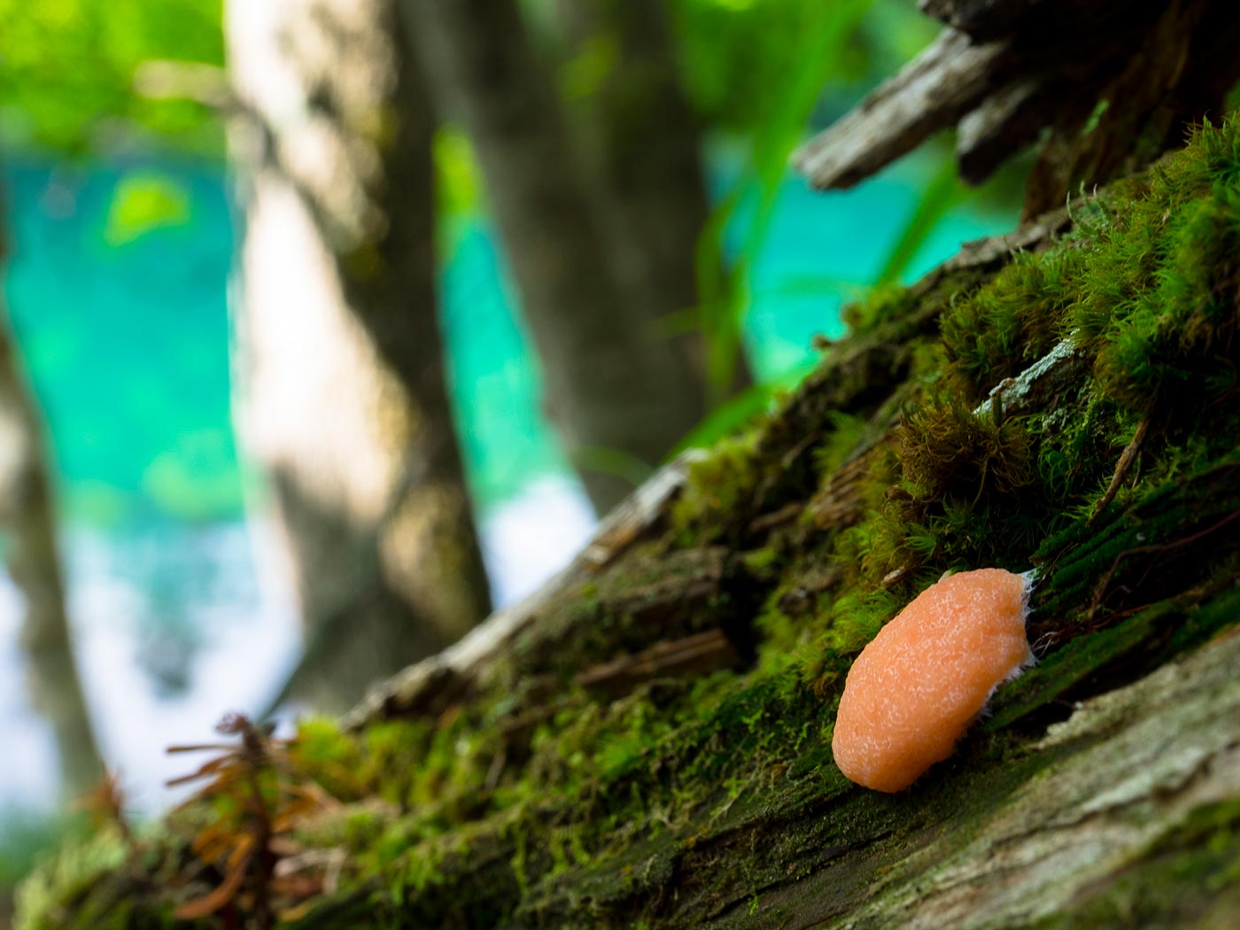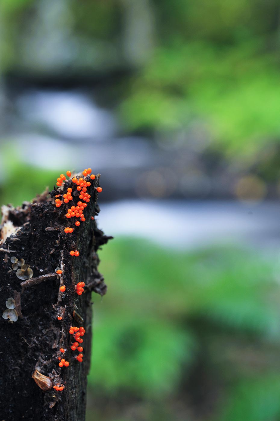 古い大きな倒木から、目にも鮮やかなオレンジ色の未熟子実体が発生。