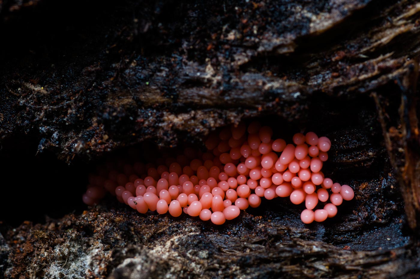 倒木のウロに発生したショッキングピンクの粘菌を見つけた時、