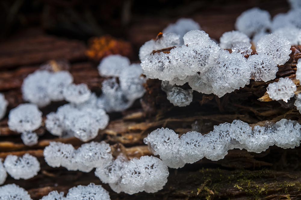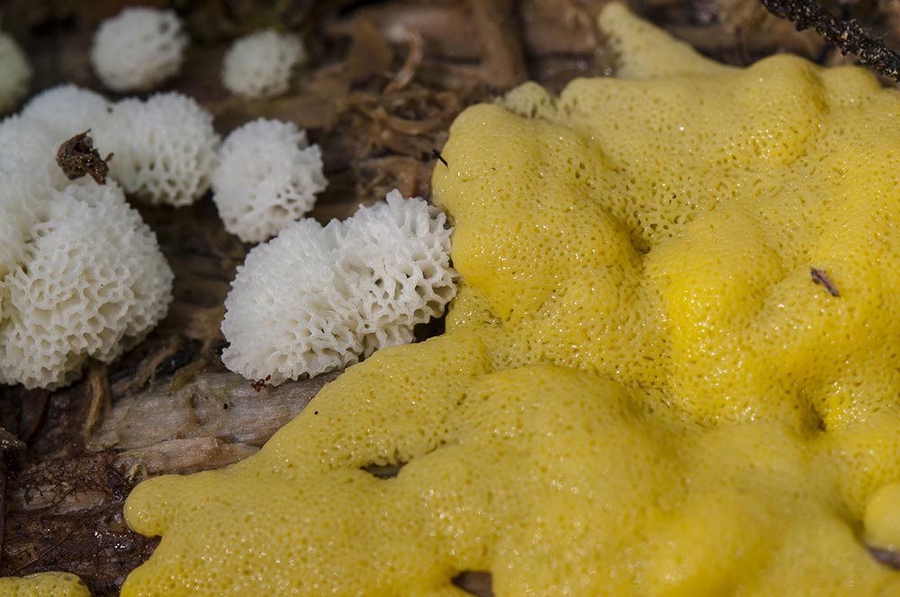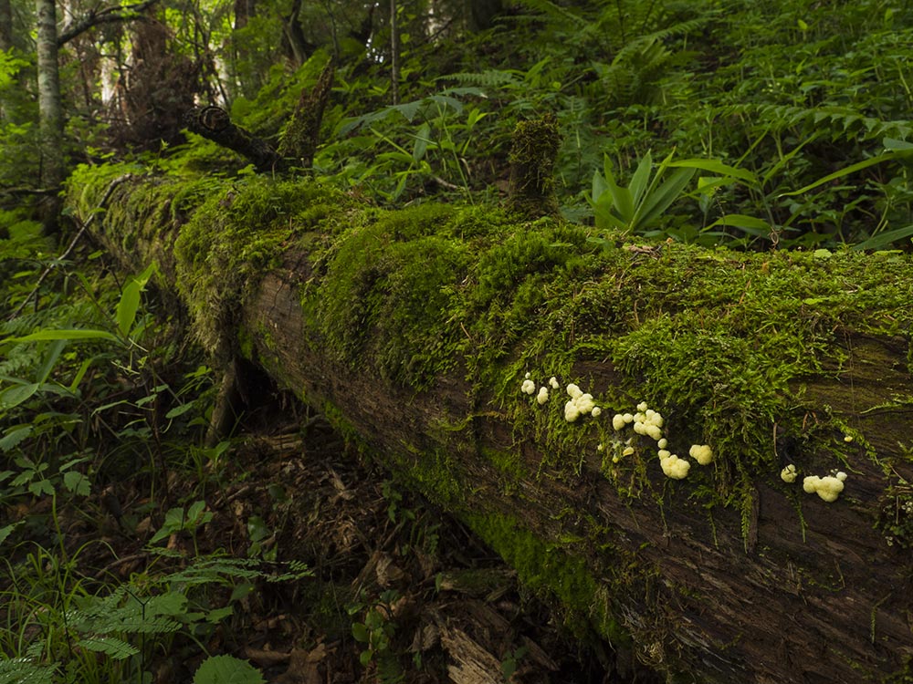 倒木に群生するキイロタマツノホコリ
