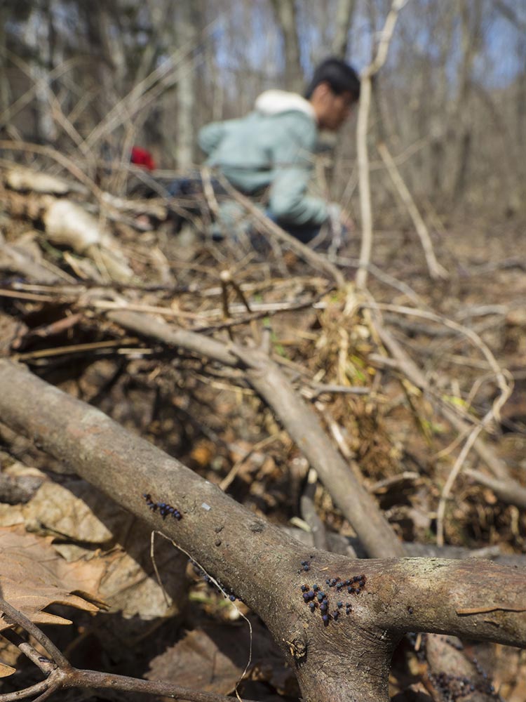 この写真はルリホコリの仲間が発生している落枝を日影に移し、