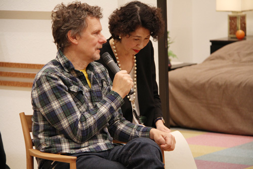 ▲姿勢を正し、ゴンドリー監督に説明をするハリー。