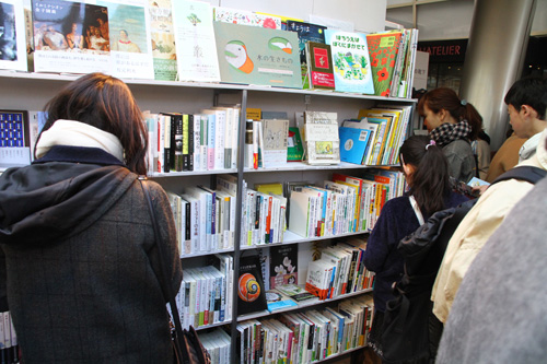 ユニークなセレクトの書棚の前には、たくさんのお客さまが。