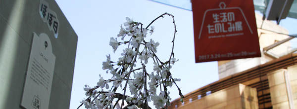 ▲「生活のたのしみ展」のフラッグと、「そら植物園 桜の花束の店」の力強い桜。