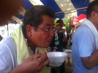 師匠は、すり身汁も食べている。 「こんーなおいしい、すり身汁。 すんごーいダシだ」