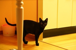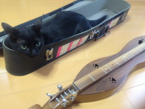 黒猫ハルといいます。母さんのダルシマーという楽器のケースが大好きで、いつもそこで昼寝をします。楽器のサウンドホールも肉球と猫。猫の日にぴったりです(^^)