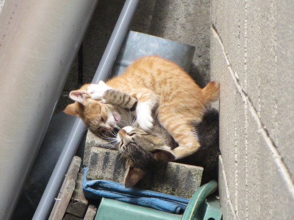 家(猫・桃太郎)外(犬・桜)見るたび同じ格好で寝ています。犬は猫になついてますが、猫は犬を寄せ付けません。近寄られると、すかさず猫パンチ!!
