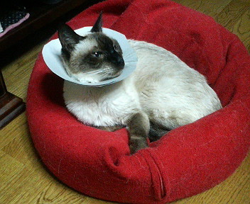 「めいわく〜(怒)!」怪我して手作りのエリザベスされてる今は亡き「ちゃこ」です。
