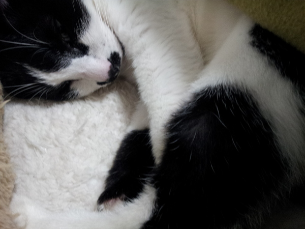 寝ている時のお鼻ピンクがかわいい白黒女子です。ねこやなぎちゃん、5歳。健康に元気にたのしくにゃ。