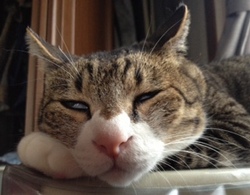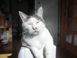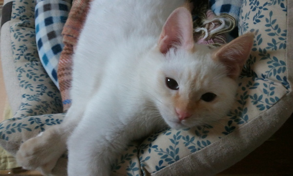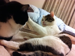 真顔で攻撃するサッチ、にっこり受けるニッチ、ゲームに熱中するオット、カメラで狙うワタシ、各自ひまつぶし中。ねこの日おめでとう