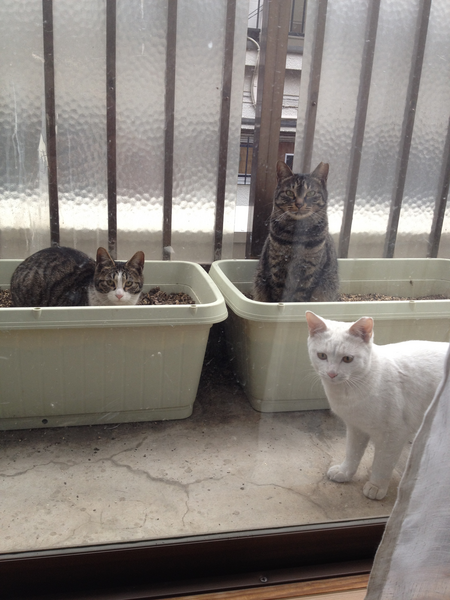 窓辺に毎日やってくる仲良し3匹です。左手からジト代→メピカ→シロヴィシャスという名前をつけました。