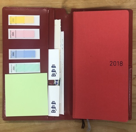 プロジェクトで使っているクリアファイルや書類のようです。手帳に入っていると打ち合わせ中もすぐに使えますしね。