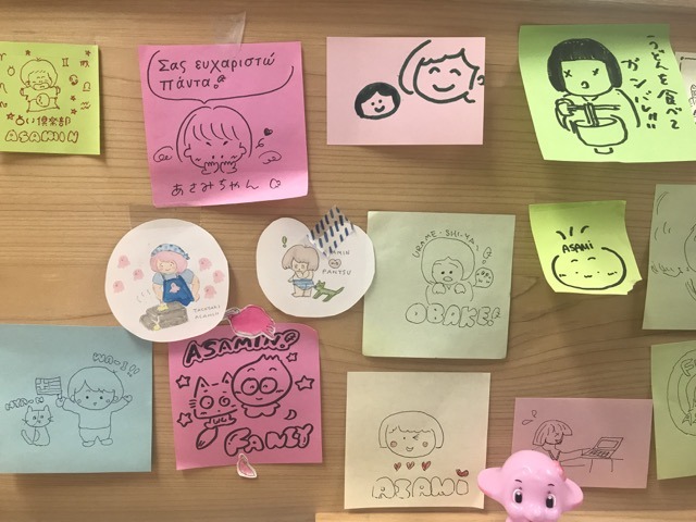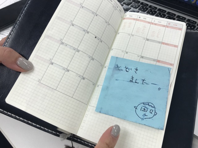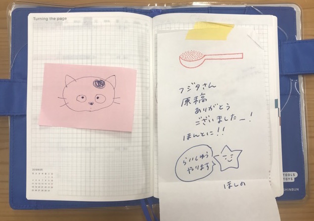 手帳にもらった付せんを貼っていたようです。しかし、ファンシーなイラスト(似顔絵?)を描いた付せんが