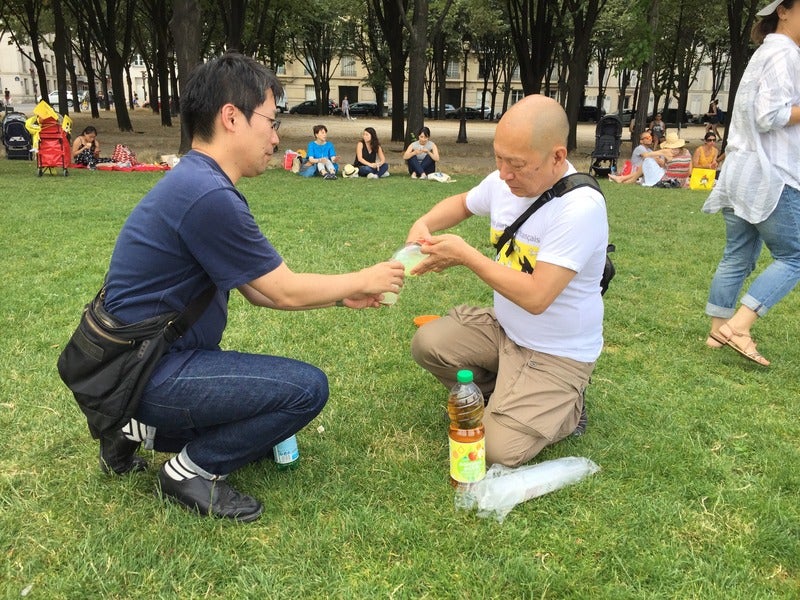 飲み物を注ぐ田中班長。