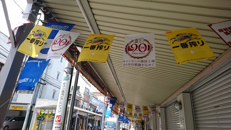 あと、生麦って駅名とぴったりなビール工場もあったりします。夏にぴったり、季節感がただよう旗がたなびいていました。