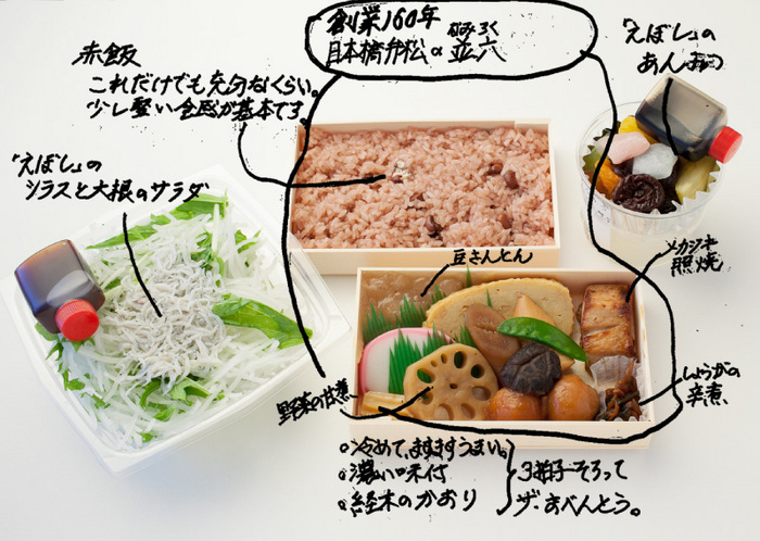 一番こころ惹かれたお弁当がカサイさんのでした。 ちなみに元々カサイさんのファンですから、 お弁当のセンスにも「さすがだ」と想いもひとしお! ちょうど最近NHK「美の壺」で 「並六」を知ったところでもありました。 大丸で買えるのですね。 福岡ではそのお弁当が買えないのがとても残念です。 東京に行く機会がありましたら、ぜひ買いたいと思います。 その日のためにお弁当の写真とメニュー、 ほぼ日手帳に貼っておきます。 ほんとうに美味しそう!! (やの) |