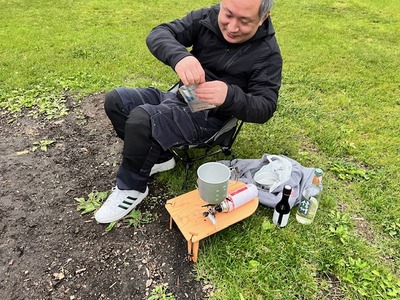 粕谷さんは焚き火のそばで、
