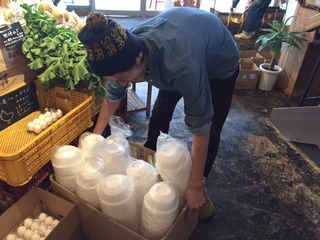 カレーうどんの器を準備中。