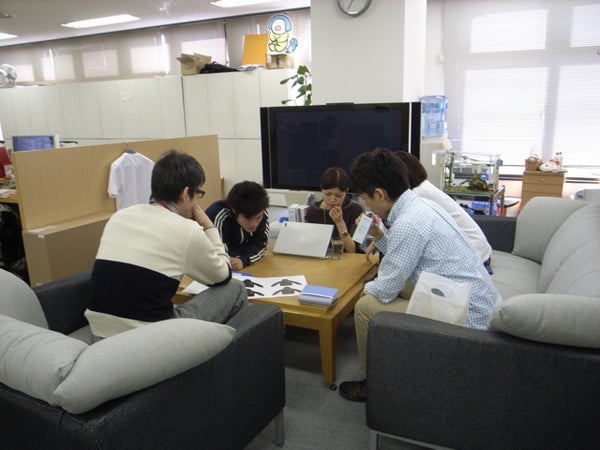 向かい合わせに座っています。