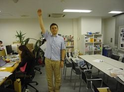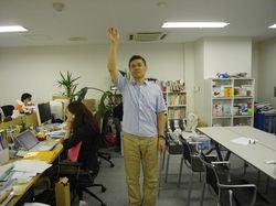 サッと片腕を頭上にあげる社長。