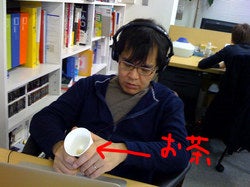 手にお茶を入れた紙コップを