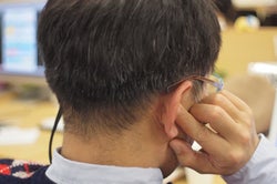 右の耳をふさいでいる