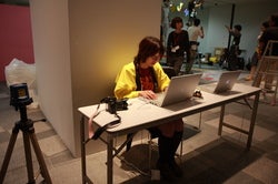 展示設営でごったがえす会場の真ん中で