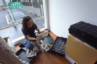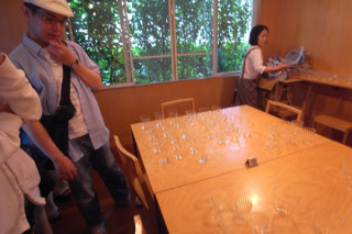 今日は搬入日だということで、 ちょこっとお邪魔してみたところ、 まさしく開梱陳列のまっさいちゅう。 新作のコップが並べられておりました。