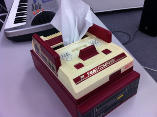 本日、21時30分より 「ほぼ日」の会議室より配信される サカモト教授の8bitジュークボックス。 普段はサラリーマンをしている サカモト教授。 昨晩のうちに機材を搬入して セッティングを行っておりました。 写真は教授が汗拭き用として使う、 ファミコン型のティッシュケース。