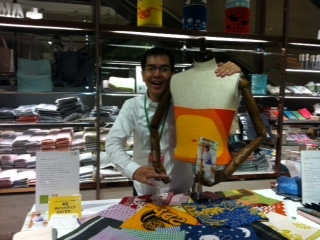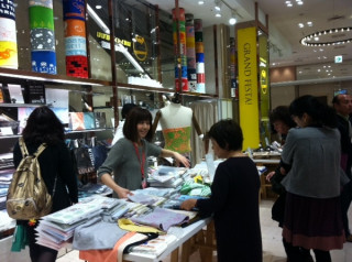 その後、残った隊長 とわたしは、 週末2日間にそなえ、 売り場の改造を行いました。 「とりあえず、ハラマキ中心やぁ。」 「アカン、こんなんじゃあ、 大阪のお客さんは満足せえへん。」 「もっとこうバァっとした感じにせなアカンのや。 色の明るいもんを前にもってくるんや。」