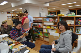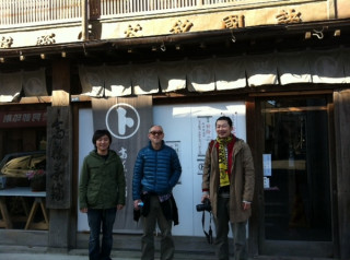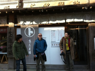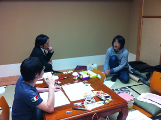 右から、 地図づくりを一緒に進めるにあたって 地元のナビゲートをしてくださる 気仙沼の老舗のお茶屋さん 斉藤茶舗の斉藤さん、 真ん中に、ほぼ日では ヌカカの結婚、断食などで たくさんご登場いただいている ムームーの森川さん、 左は、ほぼ日の西田となっております。