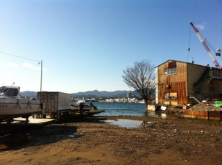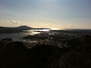 気仙沼湾を一望できる 安波山からスタート。 そこから、浪板地区の造船所では 金属の加工音がひびいていました。