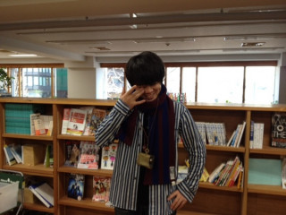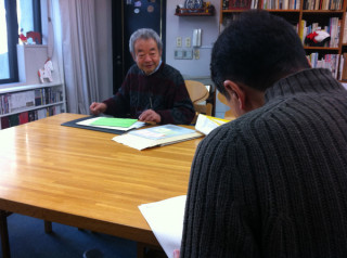 さて、編集作業中に デザイナー・メガネこと 清水さんが来訪。 「どんなぐあい?」ということと いろんな打ち合わせをしに。