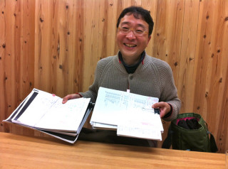 ただいま、編集者の松家さんと 本をつくっています。 たのしい本づくりです。 その松家さんがいま 両手に持っているものは 2冊ぶんの本の「原稿」です。